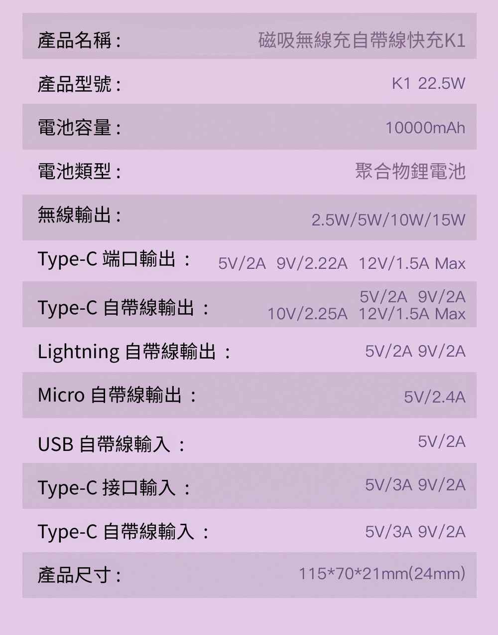 • 白-ONAIR全功能自帶線磁吸無線行動電源-K1(10000mAh)(3C認證)