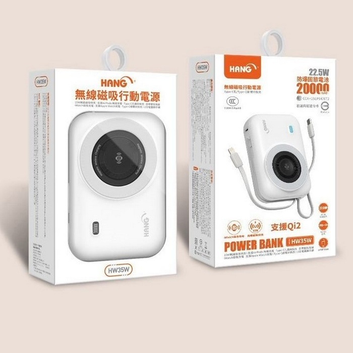 • 白 HANG-HW35W防爆固態無線磁吸帶雙線20000mAh行動電源-3C認證