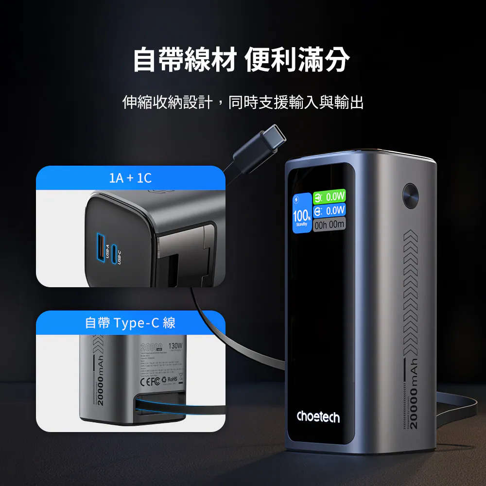 Choetech狠能充20000mAh PD130W 筆電快充自帶線行動電源B815C-南區限定販售